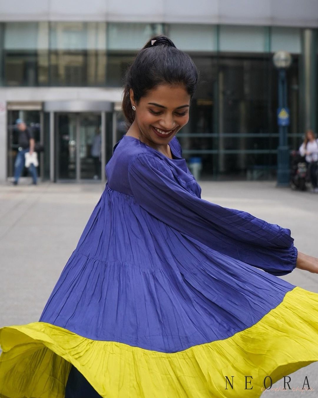 Blue-Neon short dress with full sleeves and gathers thoughout and neon gathers at the end