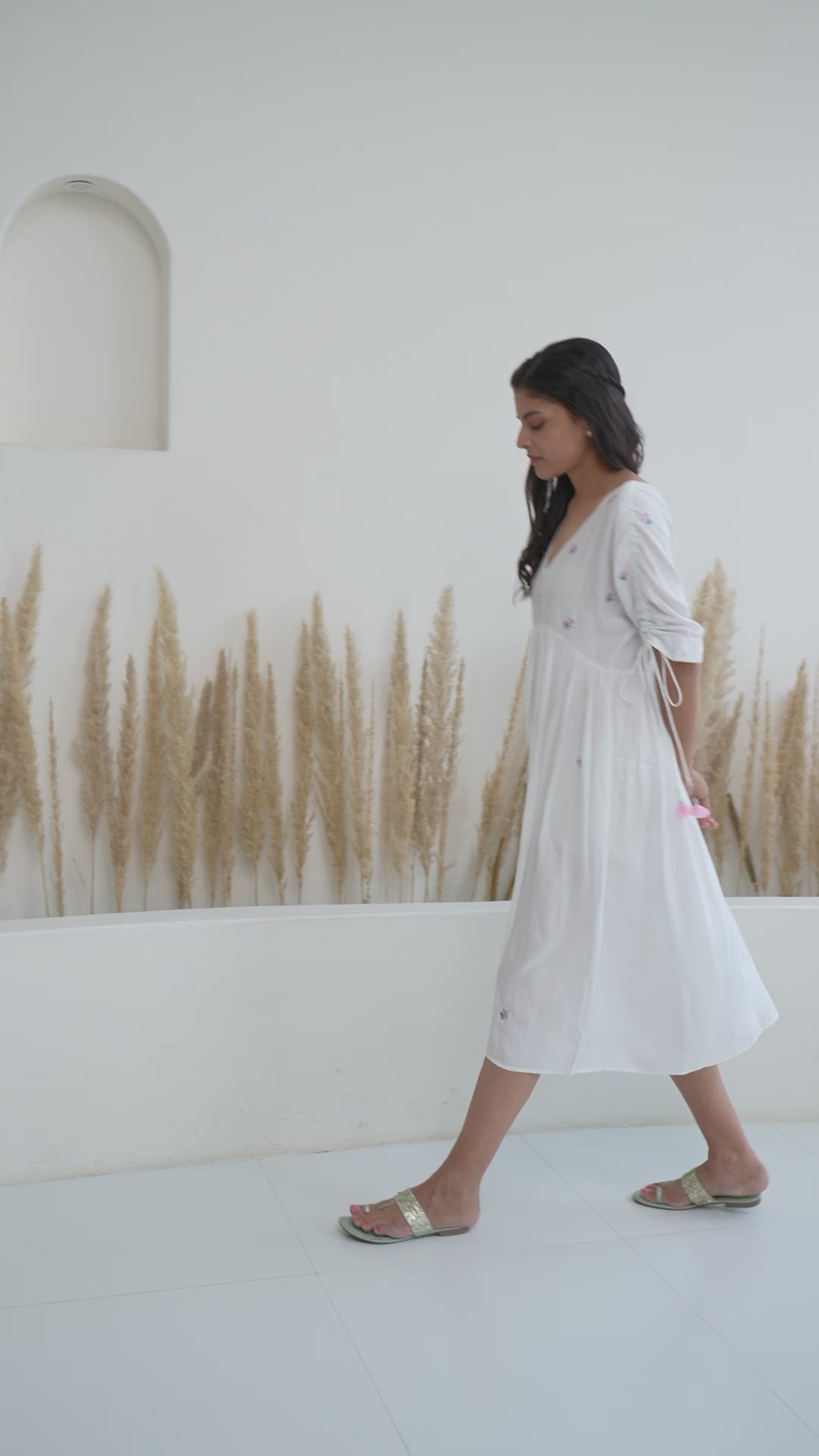 This Dress is designed to provide maximum comfort while still maintaining a fashionable look. Dress in White Modal Fabric with Gathers on the waist and adjustable sleeves with dori. Uniquely embroidered small butis by machine on the yoke and handcrafted tassels beautifying the look. The soft and breathable fabric will keep you cool and comfortable all day long.