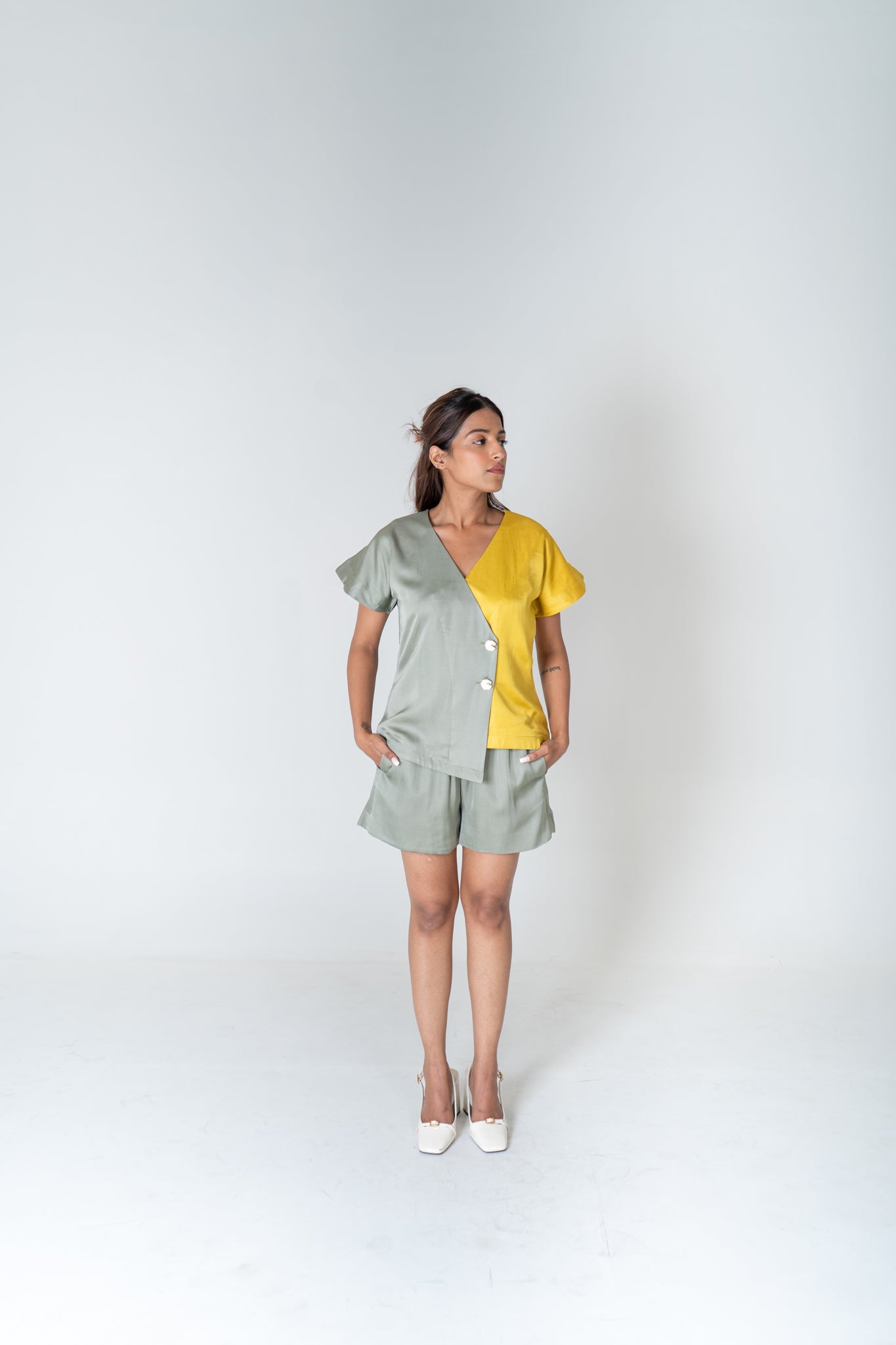 Green-Yellow Short Co-ord Set; Shorts and Shirt with button detailing