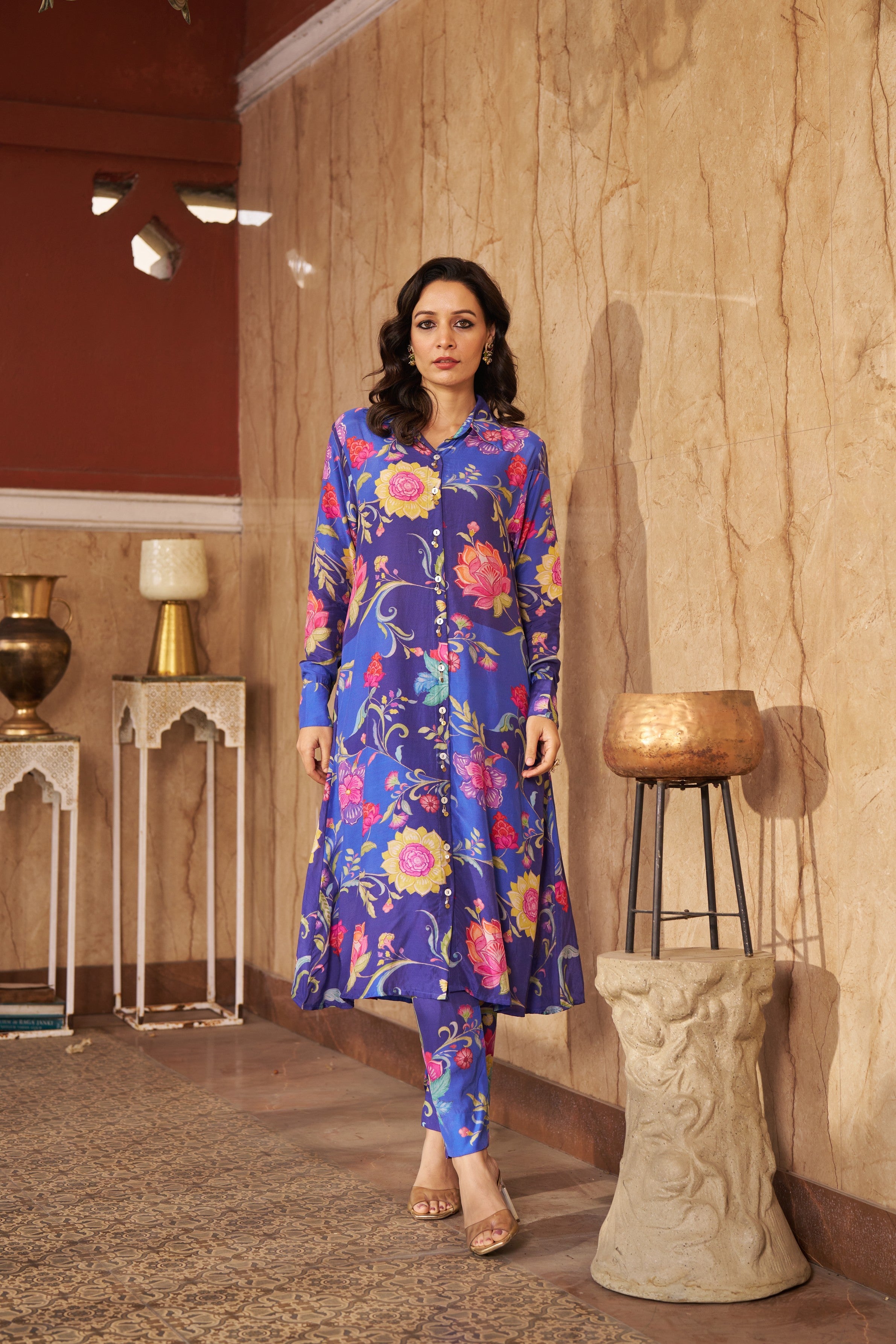 Featuring Digital Printed Floral Collar Style Front Button Style Kurta, Finished With Handmade Tassels, Paired With Straight Pants In Cotton Silk.